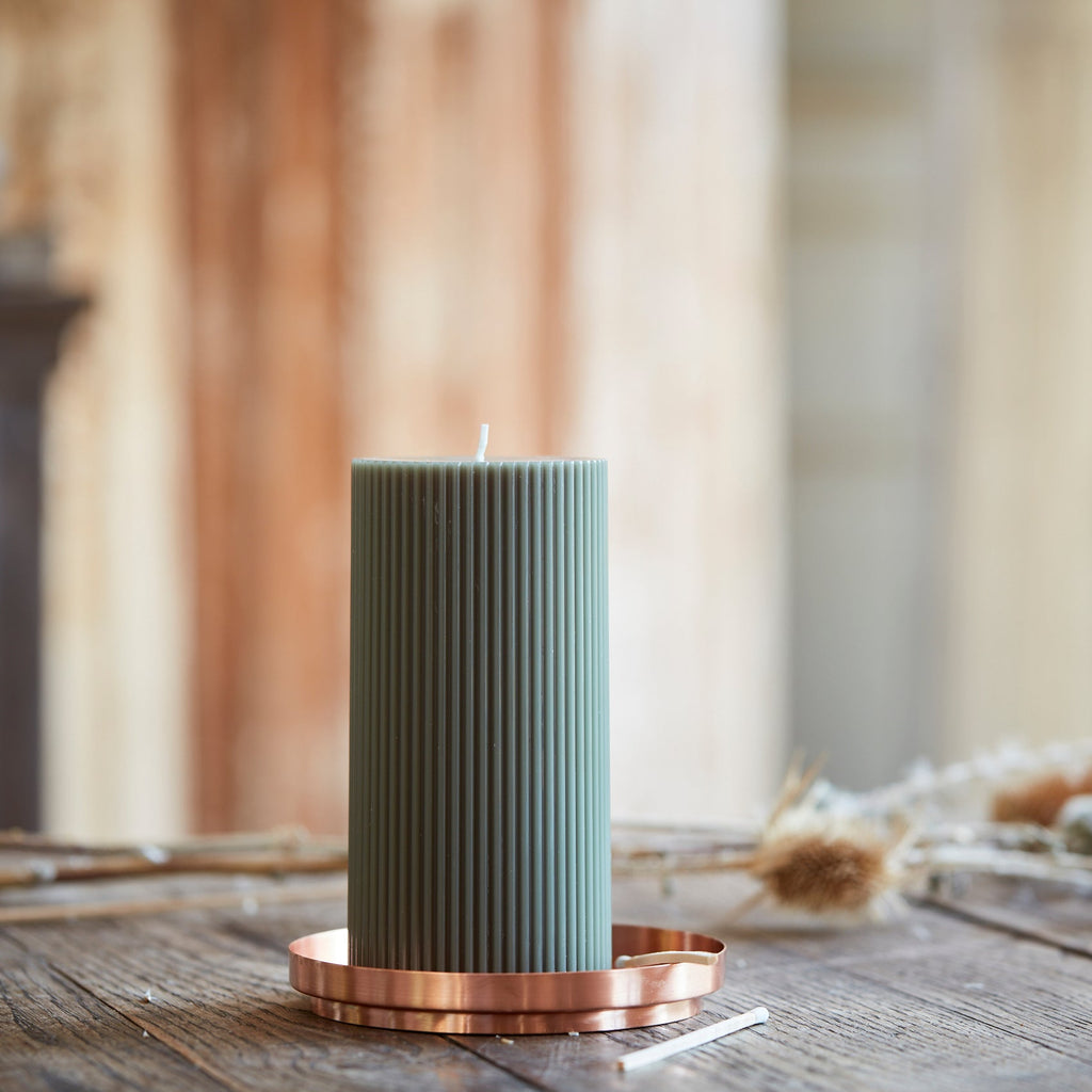 This copper pillar plate is the perfect companion to our fancy pillar candles. Its wide base provides a safe surface to burn pillar candles and the simplistic design proves to be an ideal accent piece to any space. Makes a great jewelry catchall too. Made of copper-plated iron and hand-finished—slight variations may occur.   Dimensions: 5” D