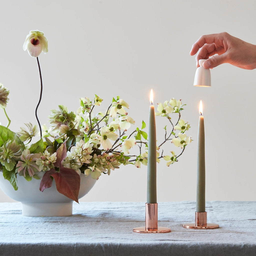 Due to the handmade nature of this product, slight form variations may occur. We suggest using our Copper Candle Sharpener and Candle Helper to fit tapers easily. Made of copper plated stainless steel and hand finished.